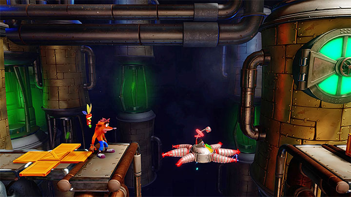 Destroy the first few crates that are near the starting place. Thanks to that you can get, e.g. an Aku Aku mask. Go right and when you avoid a trap get closer to the first robot. The best way to deal with those enemies is to perform a slide. Keep moving right and eliminate similar robots. When you reach a group of working pistons you must wait for the right moment to start running right.