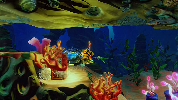 Swim into a metal construction and interact with something similar to a submarine that will help you in your journey (sadly, not throughout the entire level). It has an unlimited number of torpedoes that can be used for destroying crates and to eliminate enemy fish. However, the most interesting use of the torpedoes is the ability to destroy red coral reef (an example is presented in the picture above). Each red object like that hides a new crate.