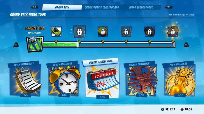 - Grand Prix - various challenges (e.g. Complete Android Valley in 3 minutes, etc.) that reward you with Nitro Points. These points fill up the green bar that unlocks new skins, stickers and a new playable character.