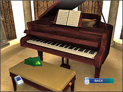 Go back to the main view and start turning the camera view to your right. There's a large statue to the left of the piano. Click on it for a new bonus. You may also consider playing the piano for a funny scene with Catherine, however this won't be necessary. There's a large handkerchief near the piano. You need to pick it up. Obviously you must use Latex Gloves here.