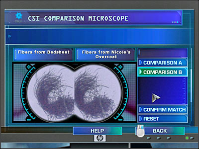 Now you will have to use a comparison microscope. Start off by taking a closer look at the Green Handkerchief. You won't have to find a match for this object. Just make sure that you've listened to what Catherine had to say. Now you will have to compare Bullet from Wall to Bullet from Everett's Revolver. You probably won't receive a positive result right away, so make sure that you've used Rotate A and Rotate B buttons. Your last comparison will require you to place Fibers from Bedsheet in the left field. As for the right one, you will have to choose Fibers from Nicole's Overcoat. Performing this analysis will allow you to unlock a new warrant. Head on to Brass' Office.