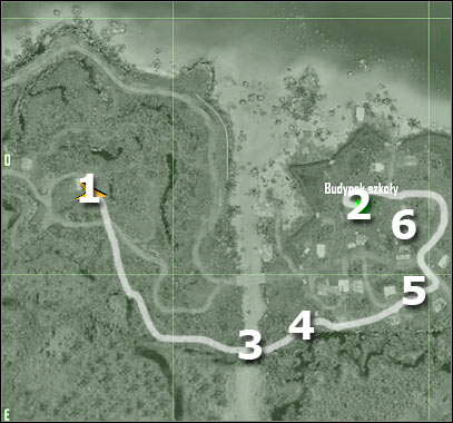 Eventually you will have to get closer to the river (3 on the map). Be careful here, because one of the enemy soldiers will appear in front of you. Kill him quickly, but make sure that your weapon has a silencer attached to it. Once he's gone, cross the river and move closer to the village. You will have to "disappear" here, so activate cloaking device.
