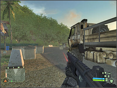 I guess you won't be surprised by the fact that there's a long and demanding journey ahead of you. Thankfully, you won't have to travel on foot, at least not until you've reached the river. You will be moving east and then north. Start off by using one of the nearby trucks. You could also ignore it and proceed to a humvee vehicle.