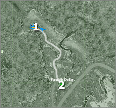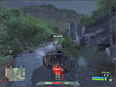 Look at the screen - that's where you'll have to stop your vehicle. A second humvee will arrive here very shortly. Destroy it as soon as possible. You can use a turret from your car. Remember that the easiest way to destroy an enemy vehicle is to aim for the fuel tank. Exit your vehicle, because we'll get to the first target on foot (it'll be a lot safer that way).
