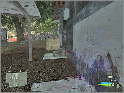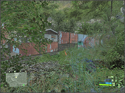 Use my map to find your way to an enemy camp. You shouldn't encounter any soldiers right away. Eventually you will come across a larger junction (screen). Activate your cloaking device here, because the surrounding area is being guarded by several enemy units. Start moving towards your current destination. Hide in the bushes and regenerate your armor there.