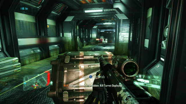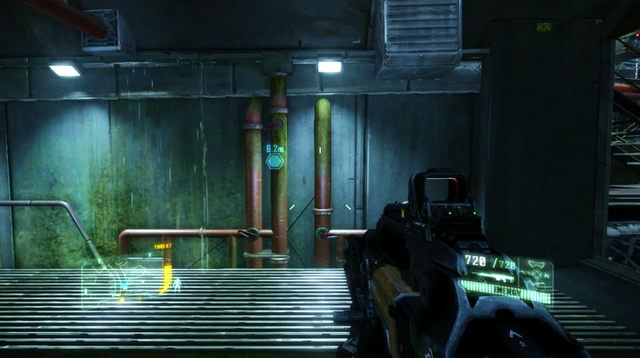 Once the elevator stops, wait for the grate in its ceiling to open and climb there. Take the venting shafts to sneak above the enemies, and eliminate them. In the same location, there is a weapon locked in an orange crate that needs reprogramming. Further on, there is an exit with laser beams. You can neutralize them with the panel to the left.