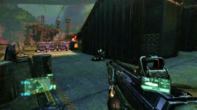 To the left of the large closed gate, there may be a few CELL soldiers remaining and a turret. Also here, will you find a Blackbox 3/3 on the corpse leaning against the container, and a Datapad 4/5, at the other side of the containers. Now you need to climb the stairs opposite the containers, in order to find a control console to open the gate with.