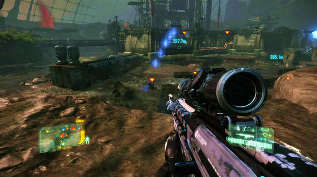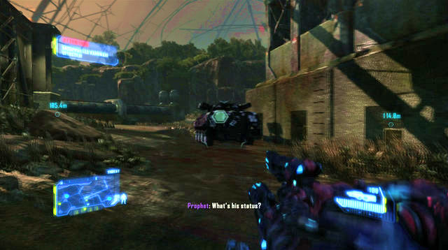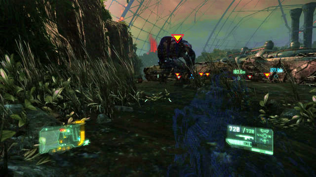 Get on the car and drive towards your objective. Soon you will be attacked by a helicopter, which you need o destroy. To the right, on the shipwrecks, there will be some enemies equipped with rocket launchers. You can either kill them all, or ignore them completely. After you drive over the broken hull of a ship, you will run into an APC. Once you reach the precipice, ignore the Ceph ship and drive down. Try and kill all of the enemies, and especially the Pinger, by using the cannon mounted on the car.