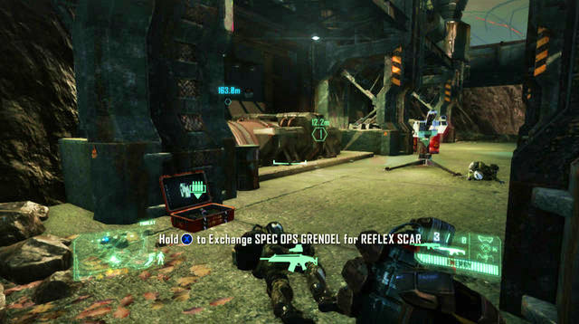 After you clear the area, approach the base and use grenades (there is a grenade box to the left of the target) to destroy the generator. Opposite the generator, there is a suit upgrade kit. Backtrack now to the passage that you took to get here, and continue towards your destination point.