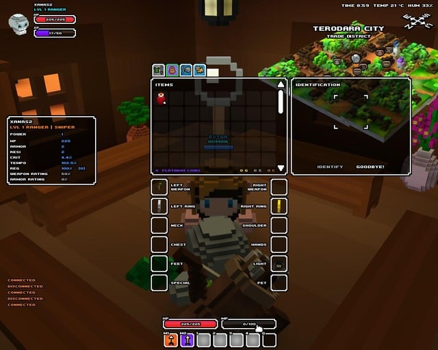 When you reach the city, you should make your first stop at the equipment shop. This is where you can buy the bottle that is necessary to prepare the health potion, as well as other useful items. Apart from the shop, you can find a few pets to tame here (more about this in the "Taming") chapter) shops with armor, Crafting workbenches (more about this in the "Crafting" chapter), a workbench to improve items on a shop for box identification and NPCs to adapt at.