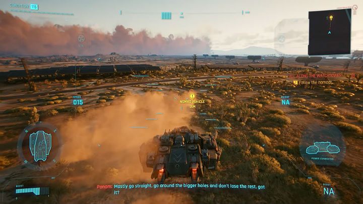 In Camp Aldecaldos, V, Panam, Saul, and Mitch discuss the plan. The official border is out of the question, so you will have to use an alternative option - the old smuggling tunnel. V takes control of Basilisk, and Panamas is on the support, and together they follow the nomads towards the tunnel.