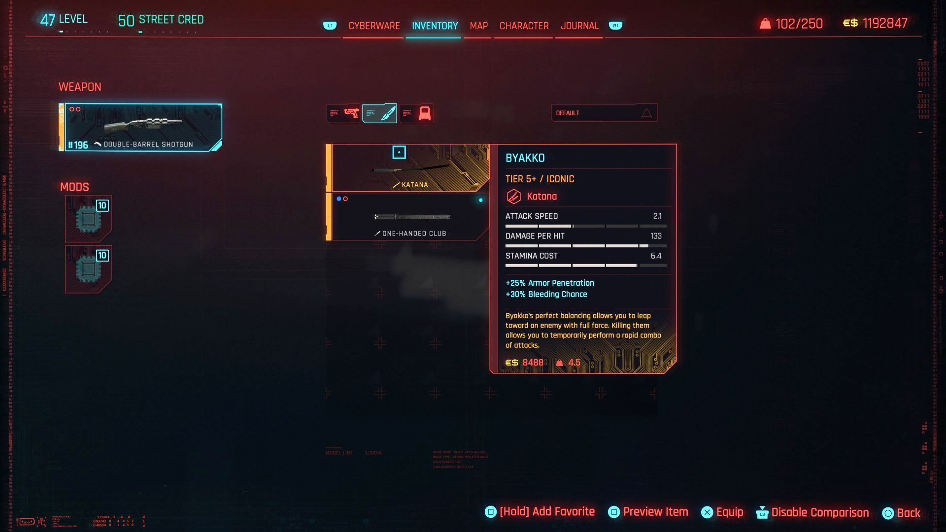 Our recommended katana is the Byakko. This weapon cannot be found or purchased in a specific location. Instead, you must complete all the Gigs in the Westbrook district. V will then be contacted by Wakako Okada. The katana is waiting for you in a drop point in one of your apartments. This katana allows you to leap towards enemies and perform combinations of quick attacks. It also has very useful bonuses to armor penetration and the chance of causing bleeding.