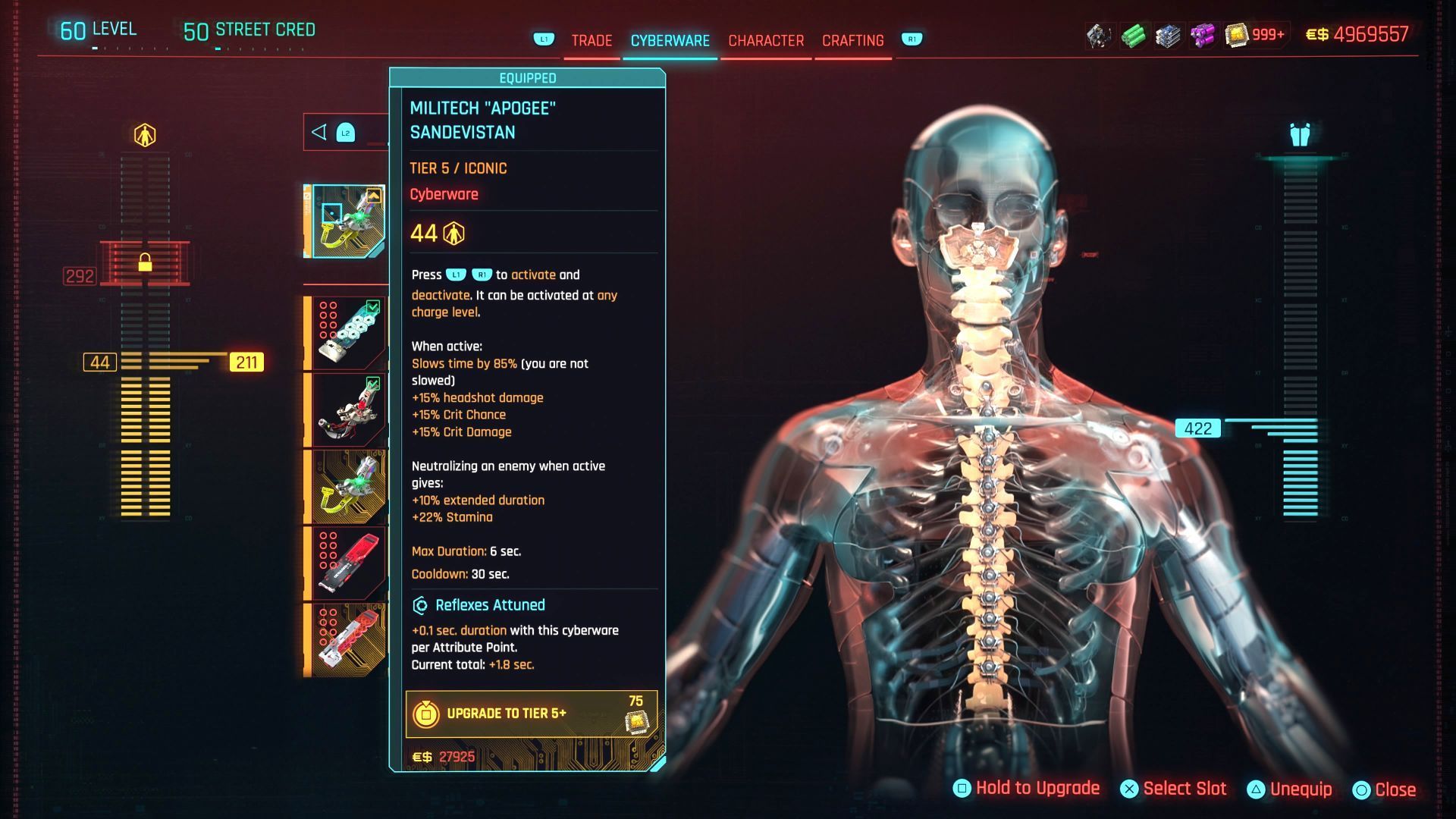 The Apogee variant is linked to the Reflex attribute and allows you to activate time slowdown, which is very helpful when wielding a katana. You will also get better critical damage chance and higher critical damage. Killing enemies while the time is slowed down can also prolong the effect of the cyberware and restore stamina faster.