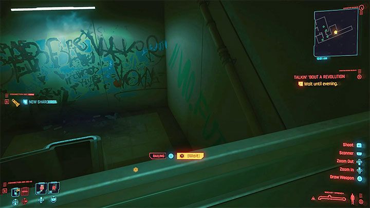 As a reminder, V's apartment is located in the Kabuki district in Watson. The objective of the mission is to appear at the party in the evening. If you arrive at another time of the day, you can lean on the railing by the staircase. The game will automatically jump to the right time of day.