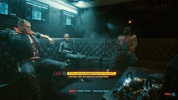 Before you start the briefing, Dex will have one question for V - how did the meeting with Evelyn Parker go? This is the moment in which you can tell the man that Evelyn is planning to betray him.