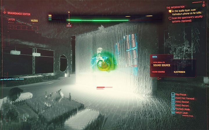 Reset the recording to start watching it from the beginning. Pause it as soon as the elevator door opens and Smasher appears. Scan the motion sensor camera on the right - you must be in visual layer. This is one of the devices associated with the second optional braindance objective - scanning all security systems.
