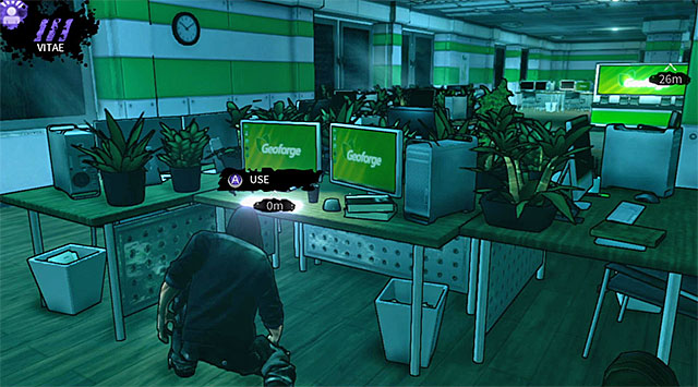 The collectible described above isn't the only interesting thing in this area. Search for a computer terminal like the one displayed on the screen above. If you've talked to April at the end of the previous chapter then you've most likely agreed to helping her. You may interact with the computer station in order to delete all electronic trace of April from the Geoforge's servers.