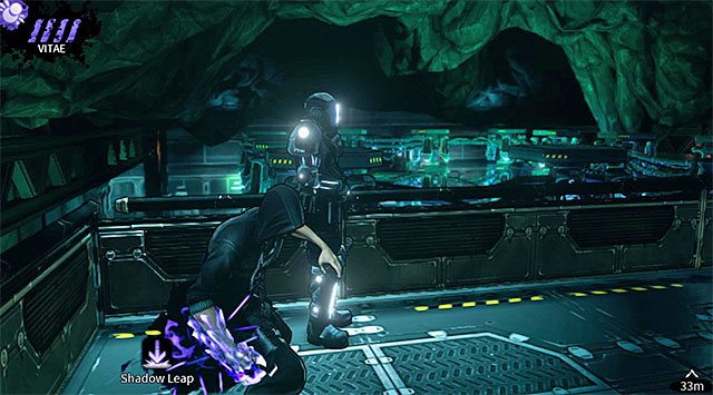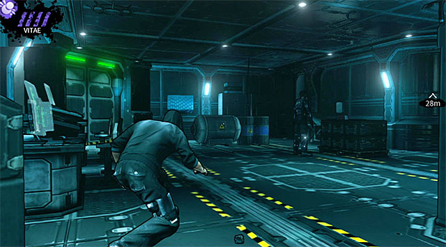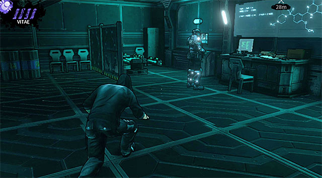 The room where you're starting has two exits. If you intend to choose the left side of the hall then it won't take long for the main character to come across two armored hunters and depending on your preferred style of play you can either avoid them or kill them. If you plan on eliminating enemy units then start by killing a soldier who often goes to the right and don't forget to hide his body. Once he's gone focus on his colleague - you can surprise this person from behind, perform a long-distance kill or start running close to a nearby cover so that the hunter will change his position and become an easier target.