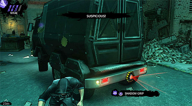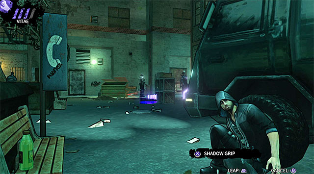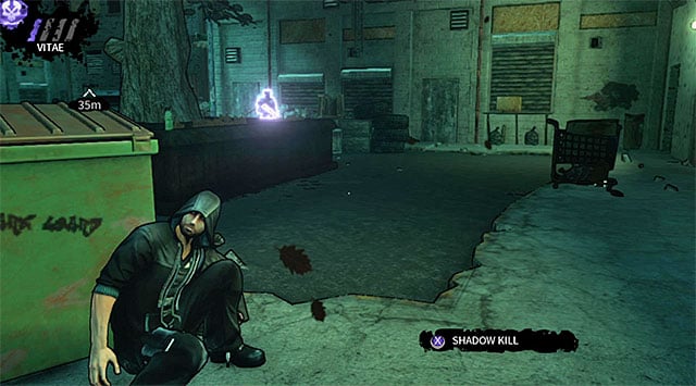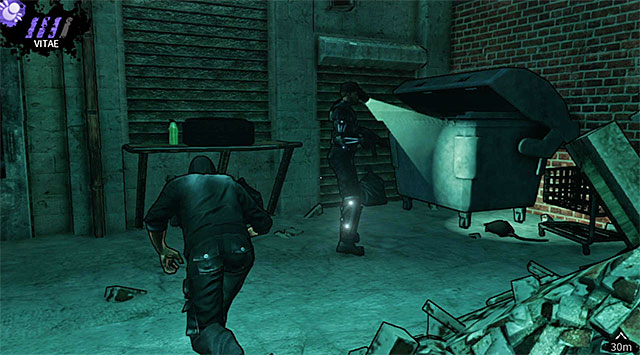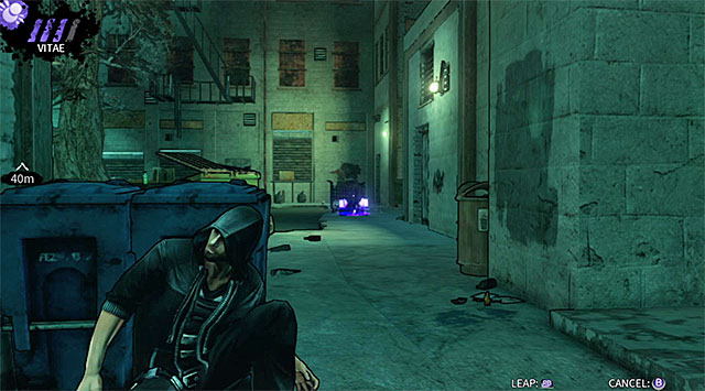 Start off by taking cover behind the nearest dumpsters. Activate aiming mode and choose the destination seen on the screen above. Start monitoring the movements of a nearby armored soldier at the same time, because he'll be moving in your direction. Wait for this person to move away from the area where you want to go and then activate Shadow Leap to teleport Eric there. Important - If you didn't upgrade your vampiric powers yet then you should try moving closer to the courtyard and to the left hunter before activating the ability and you should also pay more attention to hiding again after a successful teleportation.