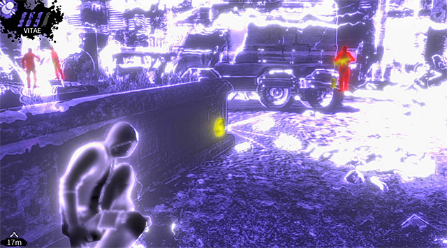 If you've fully upgraded Shadow Leap power and chosen a good destination for Eric's teleportation then the generator shouldn't come online and the hunter standing next to it shouldn't become suspicious. Otherwise the guard may start looking around and if this has happened then you must immediately take cover behind the wall of the building to your right so you won't find yourself in his field of vision. You can also try moving closer to the UV generator before activating teleportation so that when it's complete you'll be further away from the device. In all cases you must hide behind the wall of the building seen on the screen above. You must decide here if you want to leave the first courtyard right now or if you want to stay here in hopes of securing this entire area. Choosing the second option is obviously a risky manuever, however it's entirely possible to get rid of all the hunters and it's been described below.