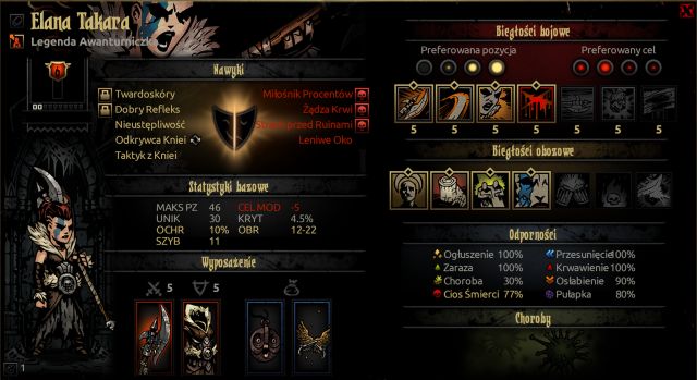 The most important resistances are the Death Blow and Disease ones - although you shouldn't neglect the others. Resistances to stun, move, blight, bleeding and debuff, as well as the chance to disarm traps increase by 10% per level of the hero (up to 60%). The remaining ones (as well as the ones described above) can be increased by trinkets, quirks, as well as hero and camp abilities.