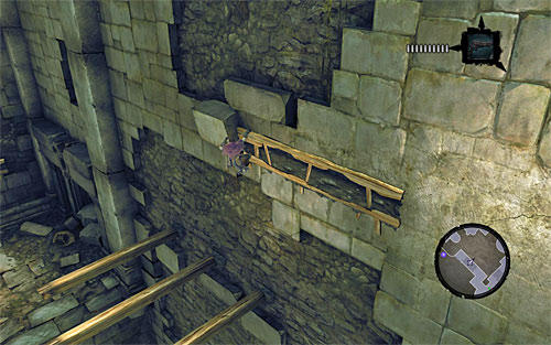 Outside, you'll be attacked by Constructs, though you shouldn't have any problems dealing with them. Afterwards, head north. Run on the right wall, grab onto the interactive edge and move left to the end. Make sure you're in the exact position as on the screen, and only then drop down to land to on the horizontal wooden pole.