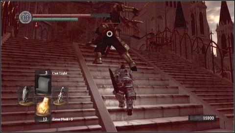 At the top of the stairs, in front of the door, you'll encounter two mighty knights. You have to lure them out one by one and kill them. They are powerful but also slow - so stay behind them, dodging or blocking their attacks (if possible).
