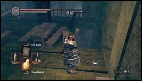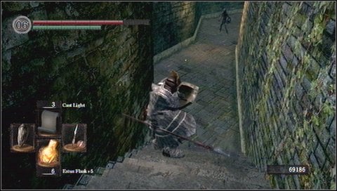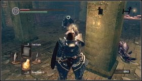 Go down. [1] You'll get to the chamber with columns, full of enemies. Be careful here - one of the enemies lurks behind the stairs (once you descend, he will stand right behind you - you can find a souls there also). [2]