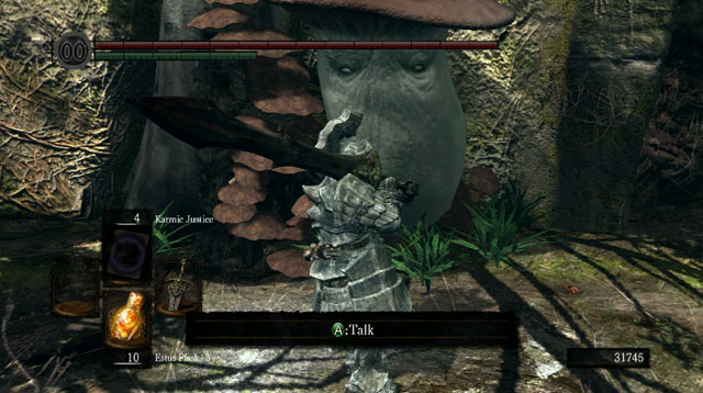 To the left of the bonfire, there is a large mushroom. Respond positively to its question. From now on, you will be able to buy spells here.