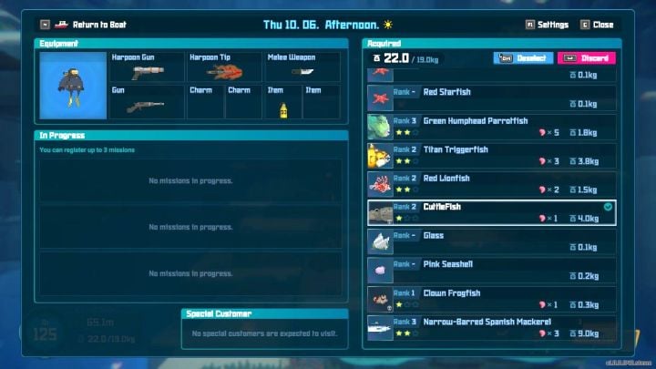- Reaching the carrying capacity in the middle of a dive is not the end of the world, as there are ways to manage it at any given moment. By pressing ESC, you can view your inventory which contains all collected fish and treasure.