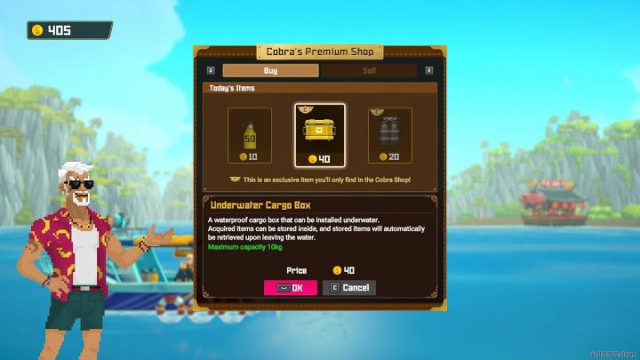 - After unlocking Cobra's Premium Shop, which takes place in the course of the story, in the shop's stock you may find Underwater Cargo Box (the offered vares are random, you just need to be lucky to come across it). This is a special underwater chest that can store up to 10 kilograms of loot.