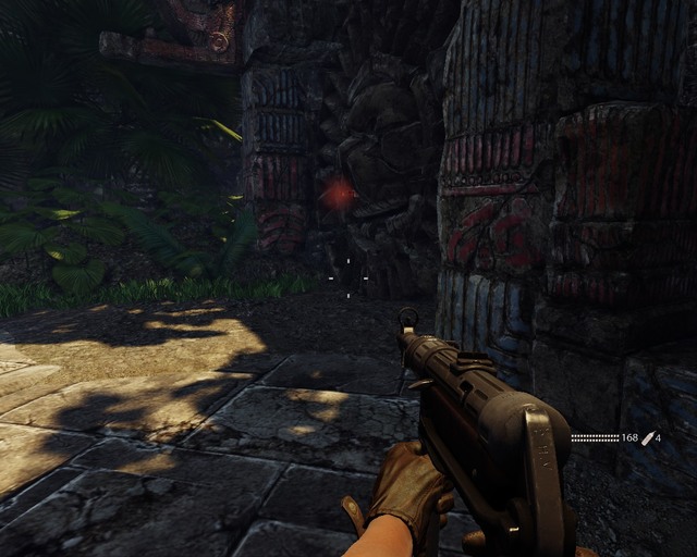 Go between skull-shaped statues and quite a big gunfight will start. There's a machine gun close by, it should be helpful.