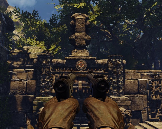 Turn around and go to the higher ledge. You'll find a wheel there. Turn it and a statue above the door will move. Turn the wheel until it stops and shoot the circle below it. Then it will move back to the previous position but some buttons will appear. You need to set the elephant symbol on the right one and an eagle on the left. Afterwards, the door will open.
