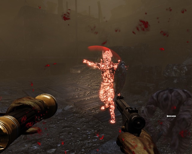 When you overcome the trap, continue moving forward until you reach a crashed plane. To get it down, shoot each engine a few times. Take dynamite and a new gun from the plane and keep going up.