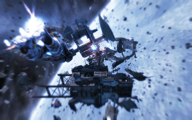 You'll find yourself in zero gravity - at the beginning controlling the flight might be problematic, so it is useful sometimes to use the key which rotates you to correct "vertical". Fly straight ahead, remembering about destroying crates and collecting ammo and other useful things.