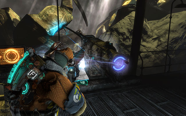 In case you haven't done that yet, right after you enter the facility, there is a workbench to your right, where you can raft a new weapon- the Probe Gun, basing on the blueprint and the collected parts. Go up now and to the first one of the harpoons. Activate the gun and when the harpoon catches on to the monster's flesh, , use kinesis to open it up. Do the same with the harpoon at the other side of the hangar.