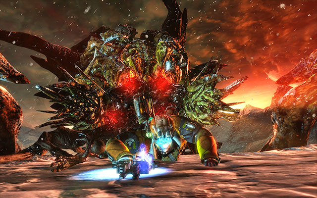 After you take several, well-aimed, shots, the monster will go mad and it will start to suck in everything, including you. To prevent being eaten, shoot at the yellow formation on the mandible. After you destroy one, the monster will stop sucking in. Repeat this tactics as long as all of the yellow formations turn red.