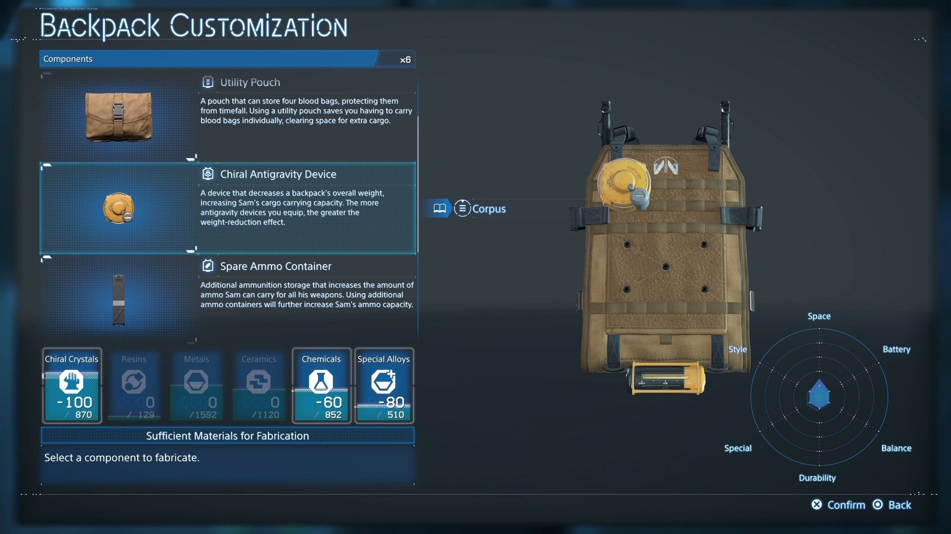 - Back Protector - Cost: 60 resin and 60 ceramics, Size: 5x3 - protects Sam's back from gunshots and is destroyed after taking enough damage. A situational component that takes up a lot of space, is only useful in open combat and has a very similar effect to the combat exoskeleton. Unlocked upon completing Order No. 9.