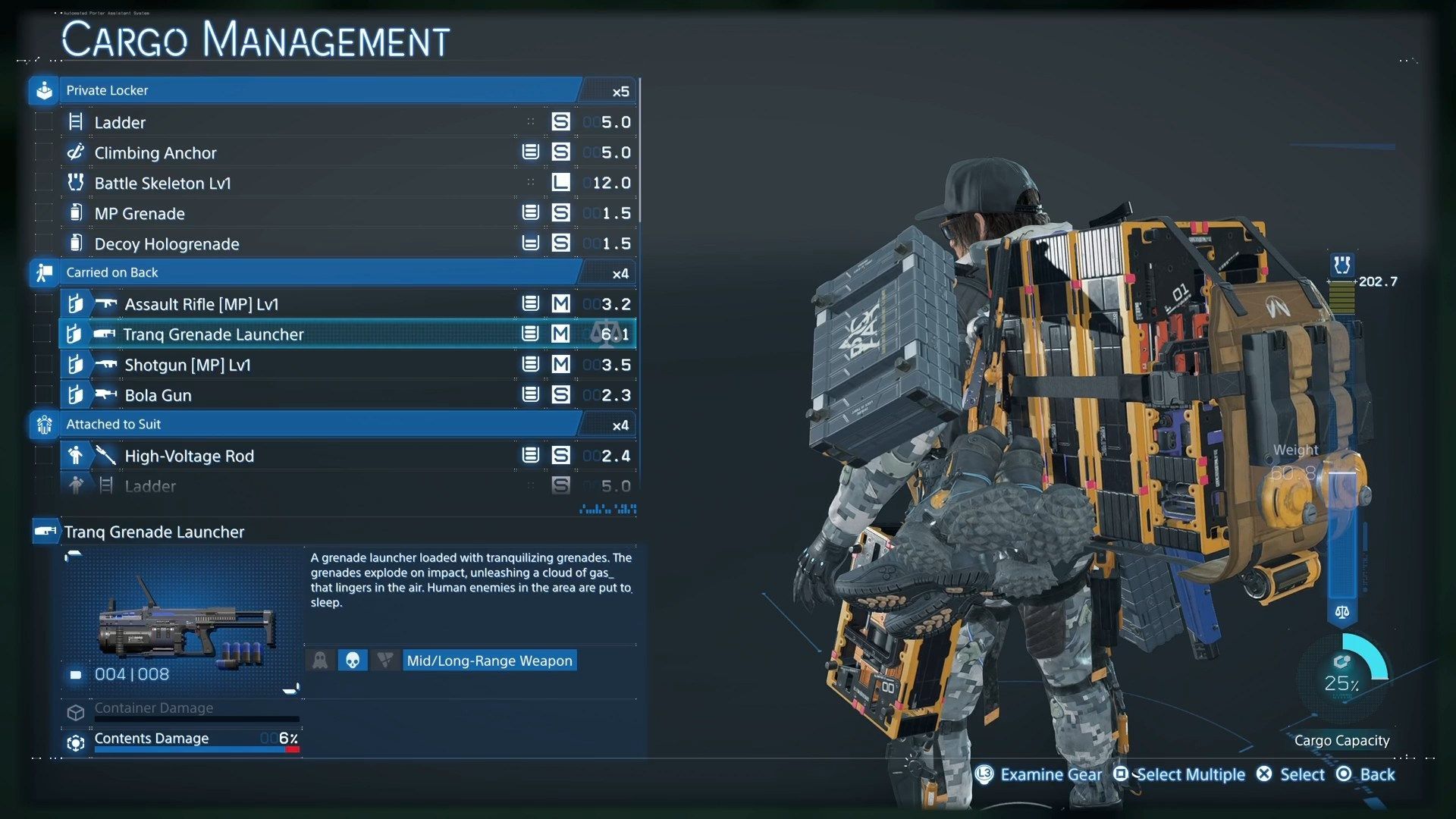 Holding up on the D-pad will take you to the quick backpack menu. Sam can among other things: automatically sort the load to take up as little space as possible or remove the backpack and leave it behind. This helps, for example, when infiltrating enemy bases, as Sam will be harder to spot without his backpack. Without a backpack, however, you cannot pick up new things, and your inventory space is drastically reduced. After removing the backpack, you can also use the strand to tie it up. This will keep the cargo from scattering if Sam falls over.