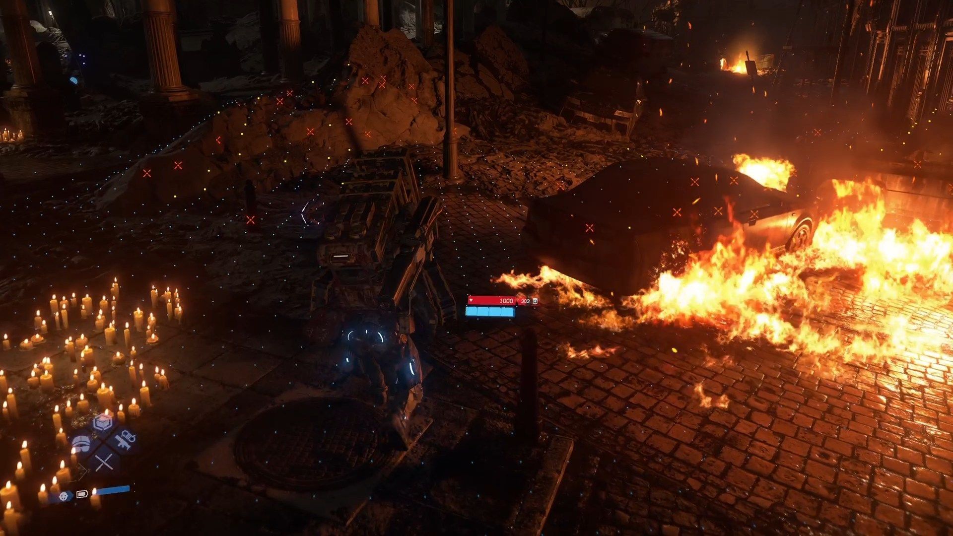 In the second phase of the fight, the boss will move to a nearby roof, which you can access via a nearby slope. Flames will start falling from the sky - you must stay on the move the entire time. The flames strike suddenly and without warning, and if they hit you, all of your equipment will scatter on the ground. This is a good time for grenades or open fire.