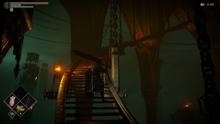 Collect all the items on the top floor. You will not be able to access certain parts of the location due to the previously mentioned hanging creature. Thus, once you're at the top, head to the next tower, the entrance of which is surrounded by fog. Be prepared for another gargoyle attack, though.