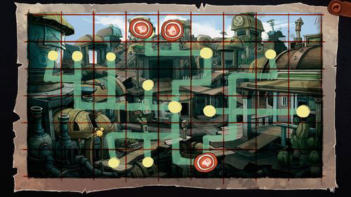 Go to the alley. I you do not remember the detonation procedure, talk to Hannek. Use Magnets on the Detonation Plan and place them as on the above screen (hats of guys in the Town Hall look like those houses with magnets on them). Close the plan and use the bell on the left to make a Blast Signal.
