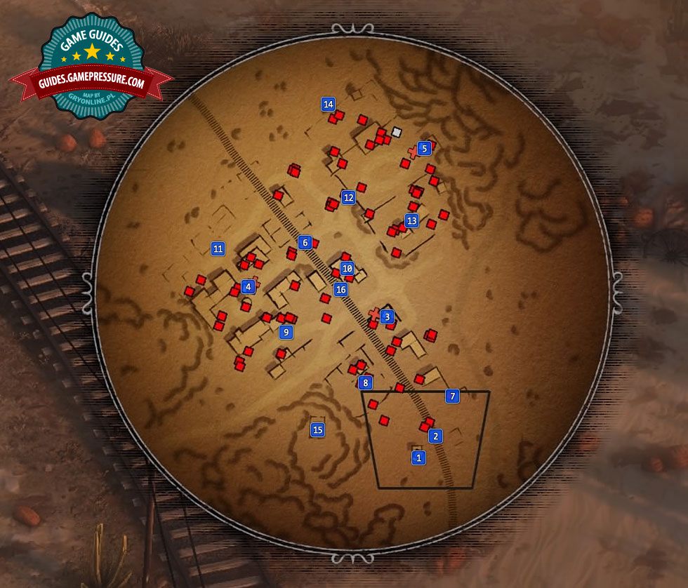 On this page of the World Atlas for Desperados 3 we have posted a detailed map for Mission 14 - The Wages of Pain. The map is characteristic for its important quest locations - these are, among others, a blockable rail crossing, an interactive wagon, and a pen with cattle. In addition, the page lists all challenges that involve placing opponents on railroad tracks and carrying Isabelle without dropping her.