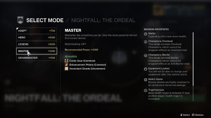 In the Nightfall: The Ordeal mission there are 5 difficulty levels to choose from. The harder the difficulty level gets the higher the amount of negative modifications will be added to the gameplay - up to 8 impediments on the highest difficulty levels. The first difficulty levels have the matchmaking option enabled so that anyone can join a solo game and be assigned to a team of 3 random players. Harder versions of this mission, such as Legend or Master don't have matchmaking - it's disabled. Depending on the difficulty level of the Nightfall mission, players can earn additional and extremely rare rewards.