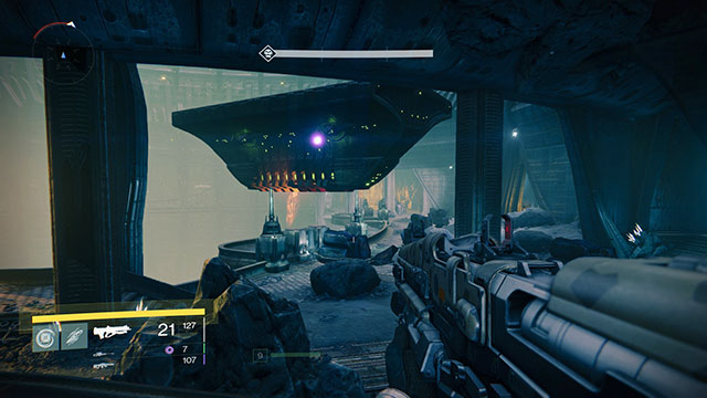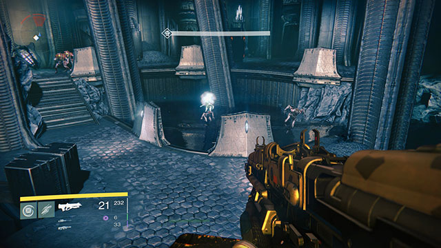 Once you exit the corridor, you will see a large chamber with an open space and the approaching Hive ship. Jump back into the corridor to hide from the projectile fired by the ship. After it disappear, start eliminating the approaching Acolytes and Knight or Wizard (only either of them appears). After you have dealt with the first group, there will appear another ship here, which will deploy another group. Deal with them and head towards the marker, across a small passage through the wall.