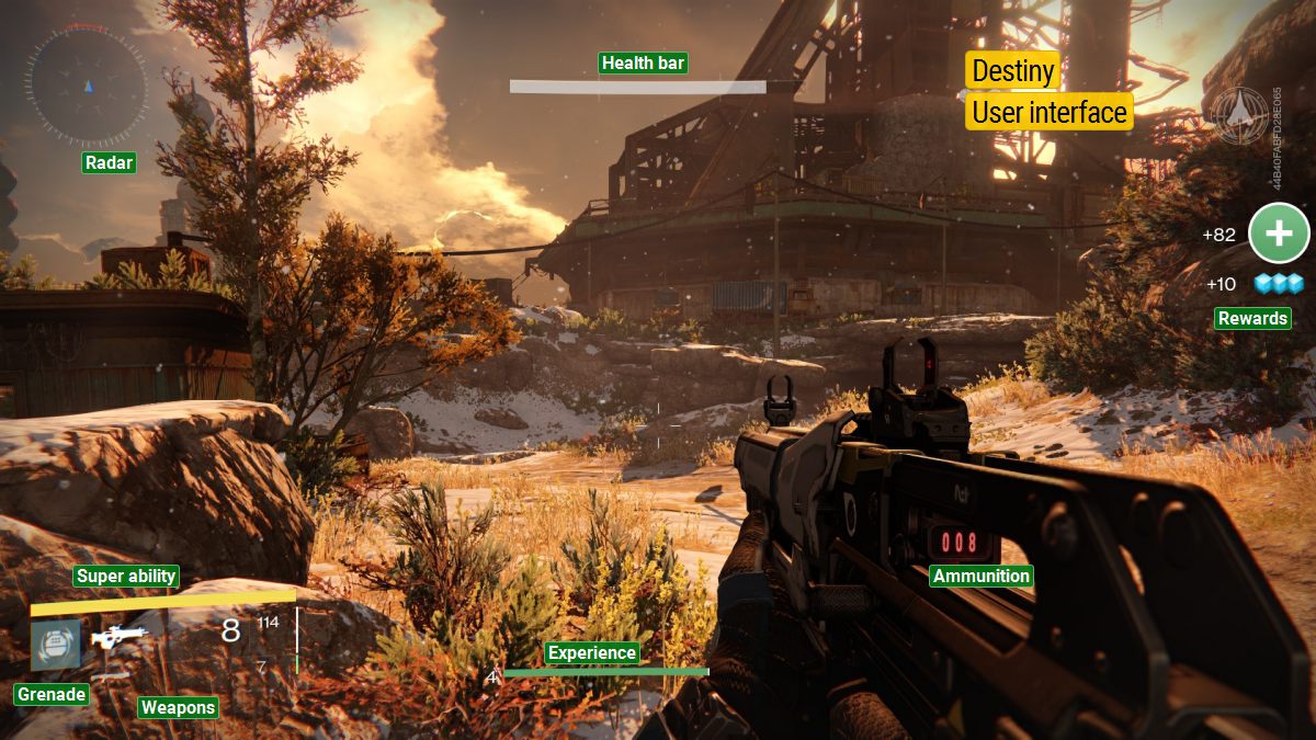 The above picture shows the key elements of the user interface that appear while traversing the game world. It is noteworthy that some information is displayed on the screen only in specific situations. For example, the experience bar appears only when the character performs an action rewarded with experience points.