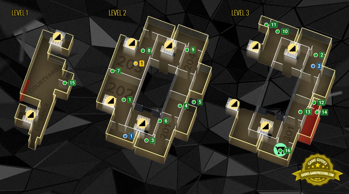The above map shows a residential block on Hlavni 33 located in the northern part of Prague (M3 map). It's a three-story construction, containing, among others, apartments and hiding places. Exploration of this district can be undertaken on one's own, or during side quests: Neon nights (apartment 202) and Samizdat (apartment 302). It is worth mentioning that the access to many rooms of this residential block is restricted by closed doors. You can also be attacked if during the looting of the apartments you are caught by its inhabitants or the police.