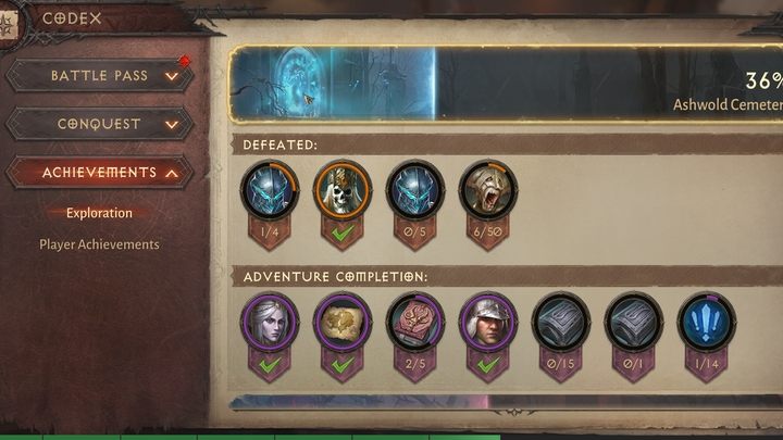 If you like side quests and secrets, in the Codex you will find Exploration Achievements that require you to complete specific tasks, find secrets or eliminate certain rare enemies "x times". Along with the Hell difficulty level, you will unlock access to some previously unavailable challenges. This includes repeatable side quests (to gain Enchanted Dust), a list of which can be found in the Codex. You can complete all the tasks to complete the Codex challenge.