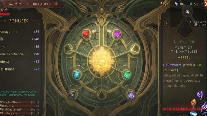 Legacy of the Horadrim in Iben Fahd's Sanctum is actually your first checklist, which will show you the next goals after completing the story. You have to face (and defeat) the indicated bosses and monsters to get special stones that provide passive bonuses for your characters and which you can upgrade. It's a good idea to deal with this first as soon as you unlock the Hell 1 difficulty level.