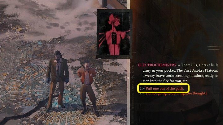 A pink orb will appear above Harrier's head, indicating the Electrochemistry skill. Clicking on it will allow you to pull a cigarette out of the pack. In the case of alcohol, Harrier will first look at the bottle and then open it.